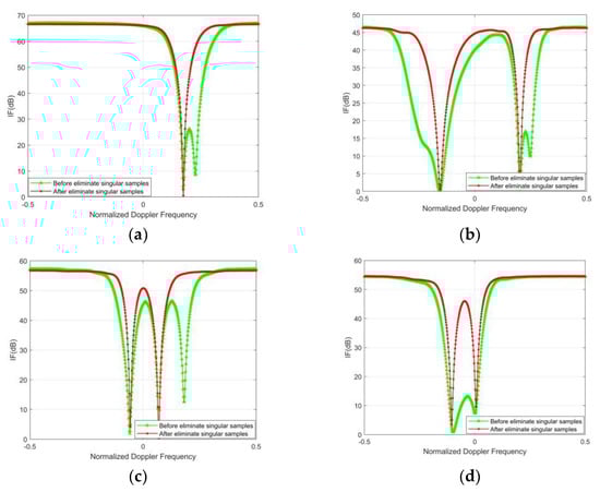 From Figure 8a–d, it can be seen that in the flight relationship 1–4, affected by the singular value samples, the IF curves all have zero limits at the positions where the singular values exist. These zero limits that should not exist will eliminate the target at the corresponding position while suppressing the clutter. After the singular sample elimination of the PROGSBLSTAP algorithm, the IF curve shows normal performance and can perform correct clutter suppression.