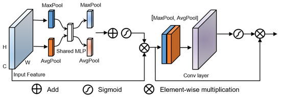 The CBAM is applied to the identity block and CBAM-convolution block, as illustrated in Figure 2. The module first performs maximum pooling and average pooling on the input feature maps to reduce the dimensionality of the feature maps into two vectors and then sends the maps to the multilayer perceptron (MLP) for learning. These two vectors share one group weight value. The vector output in the perceptron is then added and sent to the sigmoid function for activation. Later, the features are subjected to average pooling, maximum pooling, convolution, and sigmoid function procedures to concentrate even more on the cloud pixel characteristics. Finally, the convolutional features are multiplied by the original features to obtain the final features of the cloud image.