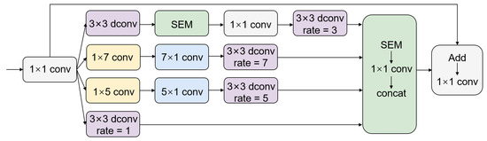 The MACM can be divided into three components: asymmetric convolution, depthwise separable convolution with different dilation rates, and SEM, as shown in Figure 4. In Inceptionv3 [26], the asymmetric convolution layer replaces the n×n convolution with 1 × n and n × 1 convolution layers, which can reduce the number of computations. Borrowing from Inceptionv3, the 5 × 5 and 7 × 7 convolutions are replaced with asymmetric convolutions. The basic intent of depthwise separable convolutions with different dilation rates is to generate high-dimensional feature maps that capture more contextual information in larger areas while maintaining the same number of parameters, which is beneficial for the segmenting of smaller clouds. The dilation rates of the four branches are set to 1, 3, 5, and 7. Each branch utilizes SEM to increase the weight of useful channels for cloud segmentation. Finally, each branch is concatenated and added to the input.