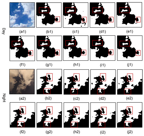 Figure 7 shows the cloud mask outputs obtained from MA-SegCloud and the other seven cloud image segmentation methods. The segmentation results clearly show that MA-SegCloud has the best performance for daytime and nighttime cloud image segmentation. In addition, the figure shows that MA-SegCloud is superior to the other seven algorithms in segmenting the boundaries of clouds and small clouds. As shown by the red box at the bottom of the nighttime cloud chart, only MA-SegCloud successfully segmented long and narrow-shaped clouds.