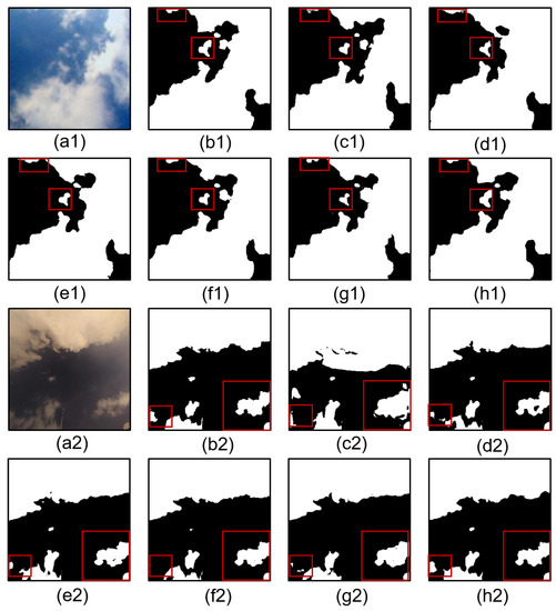 Visual output of ablation experiments on the SWINySEG dataset. (a1,a2) Input images, (b1,b2) ground truth, (c1,c2) without MACM and CBAM, (d1,d2) without MACM, (e1,e2) without SEM, (f1,f2) without CBAM, (g1,g2) without SEM and CBAM, and (h1,h2) MA-SegCloud.