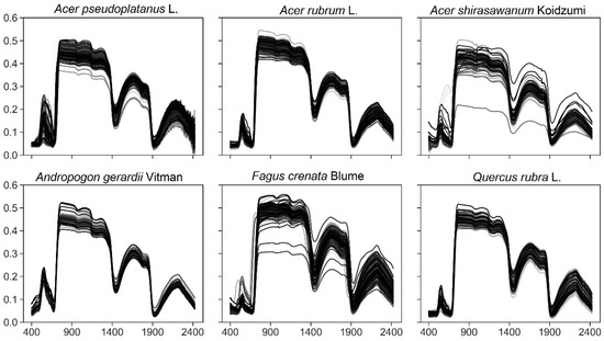 Training a classification model with thousands of spectral features generally requires a large sample size. However, since the collection of samples for hyperspectral studies is onerous, with high costs for imagery and arduous field measurements, sample sizes tend to be small [19]. A deep learning model needs enough samples for training and validation; BeamLab suggests 100–1000 samples [36]. In this study, species selection is based on sample sizes in the collected dataset and whether there are enough prediction items for each species. For datasets from one laboratory, it is hard to get enough hyperspectral data samples for each species. We chose a sample from more than 80 places and laboratories as the target species, and finally selected Acer pseudoplatanus L., Acer rubrum L., Acer shirasawanum Koidzumi, Andropogon gerardii Vitman, Fagus crenata Blume, and Quercus rubra L., and a total of 945 samples were included in this study. The sample size, symbol, and code for each species are shown in Table 1. The general performance of models was tested using data from different laboratories or years by separating them for training and prediction data, and the training leaf spectra are shown in Figure 2.