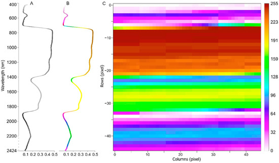 Sample of one reflectance structure data item reshaped into a 45 × 45 shape image. (A): original reflectance structure data; (B): colorized reflectance structure data; (C): reshaped 2D image data. Reflectance wavelengths range from 400–2424 nm, and 2025 features are selected. Generated origin image is greyscaled, and the sample image is colorized to better understand each part of the reflectance. Reflectance values in the range 0–1 are reshaped into the grey image, with integer values scaled to 0–255. Hence, row 0 and column 0 represent 400 nm wavelength scaled value, and row −44 and column 44 represent 2424 nm.