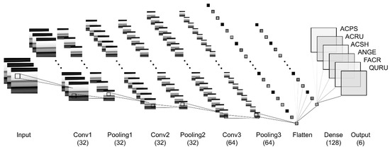 Eight fully convolutional neural networks (CNNs) based on leaf reflectance data for species identification were developed. Each model contains one input layer, one or more convolution (Conv) and pooling (Pooling) layers, one flattened (Flatten) layer, one dense (Dense) layer, and one output layer with six channels (dense) corresponding to the six species. These models differ mainly by the number of Conv and Pooling layers. Table 2 summarizes the CNN model architecture. Figure 4 shows the CNN8 architecture in this study.