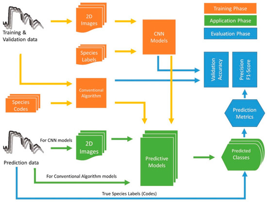 This study includes training and validation, simulate application, and evaluation phases. In the training phase (orange in Figure 5), training and validation data are reshaped to 2D images for CNN and taken directly as input for conventional algorithms. Validation accuracy is generated in this phase. Both CNN and conventional algorithms then generate predictive models. We take the prediction dataset as the unseen data for identification and simulate this phase (green in Figure 5) to evaluate the general performance of each model. The actual species labels and identified labels are used to calculate confusion metrics. Validation accuracy from the training phase, precision, and F1-score from the application phase are used to evaluate each model’s performance (blue in Figure 5). By adding the simulated application phase, we determine whether the predictive models can be widely used for leaf reflectance data from different places, labs, and periods.