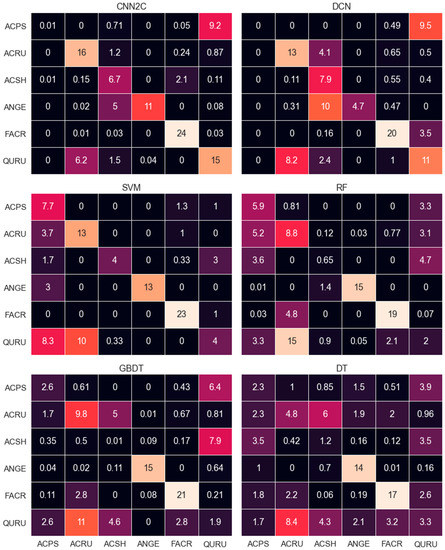 CNN2C performed second best on ACSH, with 74.4% precision, while DCN was the best, at 87.8%. Conventional models had significant difficulties separating ACSH from other species (Figure 6). No neural network model could identify ACPS. CNN2C and DCN tended to predict ACPS as QURU (Figure 6). SVM had a correct prediction ratio of 77% on ACPS, which outperformed the other models.