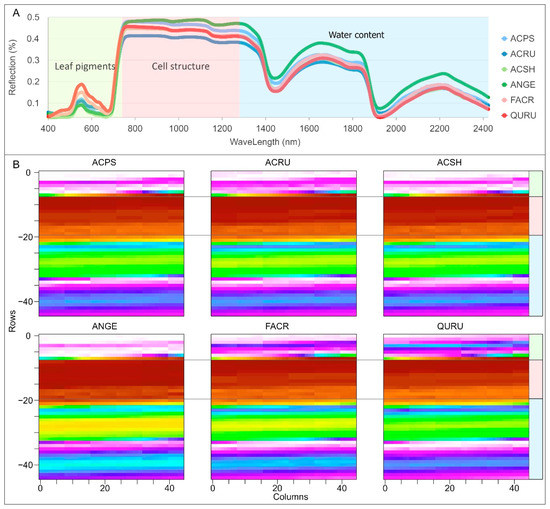 Average reflectance and respective reshaped 2D images of six species. Grey images are colorized for better understanding of reflectance for the reader. (A) structure reflectance curve; (B) reshaped images (45 × 45).