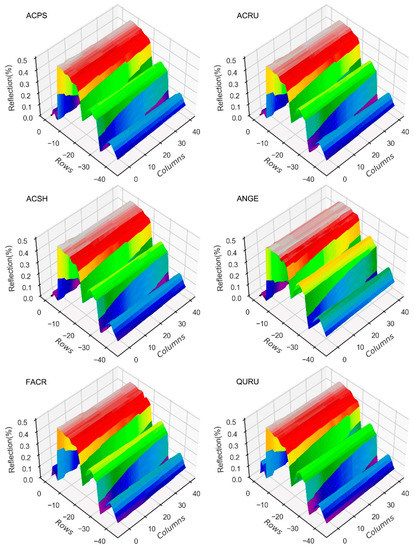 Average reflectance image-stretched 3D charts of six species. Reshaped grey images are stretched into 3D charts and colorized. Differences in structured data are one vertical dimension; while being reshaped into a 2D image, differences between lines will be scaled into a surface. Thus, CNN models may learn more features from image data than DCN and conventional models, which use 1D structured data.