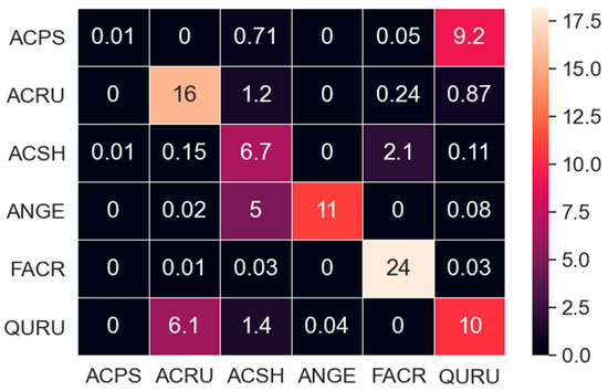Furthermore, the CNN2C model well separated ACRU, FACR, and QURU. Surprisingly, although all neural network models had difficulty distinguishing between ACPS and QURU, SVM performed much better. It is noticed that the ACPS training data were from ANGERS, using an ASD Field Spec spectroradiometer, while the identification data were from LOPEX93, using a Spectral Evolution PSR+ spectroradiometer. To determine whether the difference in instruments caused the problem, we excluded the five LOPEX93 QURU data items from the prediction dataset, and reinvestigated the application phase for the CNN2C model. The results showed that the correctly predicted QURU decreased from 15 (Figure 6 CNN2C) to 10 (Figure 9), 6.1 out of 23 QURU were still predicted as ACRU. This means that neither the different datasets nor the difference in instruments caused the problem, and that the CNN models may have learned characters similar to ACRU and QURU, finally causing the misidentification of QURU. More examination may be necessary.