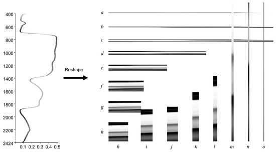Sample of a reshaped full wavelength reflectance structure data item. Reflectance wavelengths range from 400 to 2424 nm, and 2025 features are selected. There are 15 factors of 2025 (1, 3, 5, 9, 15, 25, 27, 45, 75, 81, 135, 225, 405, 675, 2025), so the image shape will be: (a) 1 × 2025; (b) 3 × 675; (c) 5 × 405; (d) 9 × 225; (e) 15 × 135; (f) 25 × 81; (g) 27 × 75; (h) 45 × 45 (Figure 3); (i) 75 × 27; (j) 81 × 25; (k) 135 × 15; (l) 225 × 9; (m) 405 × 5; (n) 675 × 3; (o) 2025 × 1 pixels. Each image shape will generate a new dataset to feed the CNN models. Image shapes of (a, b, c, m, n, and o) are not fully demonstrated, as they are either too wide or too tall.