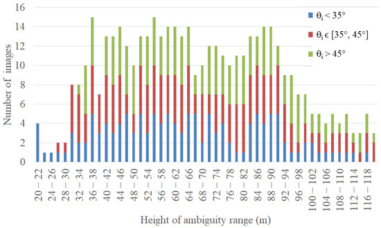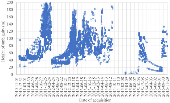 Figure 1 depicts the height of ambiguity for TanDEM-X data-takes acquired over the Amazon rainforest from the end of 2010 to the end of 2016. The values span from a few meters to 200 m. The continuous variability of the physical baseline between the TerraSAR-X and TanDEM-X satellites is made possible by the adjustable, unique Helix close orbit formation [14]. Most values of are comprised between 40 m and 60 m during the first TanDEM-X global coverage for the generation of the TanDEM-X digital elevation model (DEM) [15], from the end of 2010 to March 2012. The second TanDEM-X global coverage, from April 2012 to March 2013, was acquired with a lower set around 35 m, aiming at improving the final DEM performance after a proper mosaicking of both global coverages [13,34]. During 2013 and 2014, further data-takes over the Amazon rainforest were acquired, but with typical values higher than 80 m to limit the amount of volume decorrelation over vegetated areas. Very few acquisitions were acquired during the TanDEM-X science phase in 2014–2015 [34] and they were characterized by extremely low heights of ambiguity, which made the data extremely noisy. By the end of 2015 and during 2016, several images were acquired with different acquisition geometries and within a range of heights of ambiguity spanning between 20 m and 120 m.