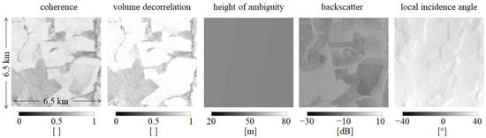 Example of input features patches of 128 × 128 pixels (6.4 km × 6.4 km): (from left-to-right) the interferometric coherence, the volume decorrelation factor, the height of ambiguity, the backscatter, and the local incidence angle.