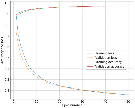 The network was trained from scratch to avoid any type of transfer learning, taking advantage of the increased amount of available data with respect to previous studies. We optimized the network by employing the Adam algorithm [39], with the initial learning rate set to . We used minibatches comprising 32 patches, randomly sampled from the overall training validation data set (80% reserved for training and 20% for validation). As a loss function, we utilized a combination of the cross-entropy loss, which showed nice convergence properties, and the Jaccard similarity loss, which accounted for the spatial distribution of neighbouring pixels belonging to the same class, as performed in [23]. Figure 5 depicts the loss function and the accuracy trends for the training and validation sub-sets, considering 50 epochs. If, on the one hand, a good convergence between the training and validation loss functions is observed, on the other hand, a slightly better performance of the validation loss is visible during the first epochs. This behaviour is probably due to the fact that, working with minibatches, the training loss is calculated for each backpropagation step during an epoch, while the validation loss is calculated at the end of each epoch only. Since each backpropagation step within a single epoch could improve the model significantly, especially during the first few epochs when the network weights are still relatively untrained, it is not uncommon to obtain a lower validation loss which later on converges to the training one.