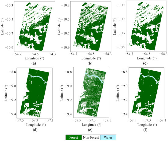 Forest classification maps for two TanDEM-X images acquired over the Amazon rainforest. The top row depicts an image acquired in April 2012 with m, while the bottom row shows an image acquired in May 2013 with m. Each row refers to an acquisition, and the Landsat forest map used as a reference is depicted (a,d), together with TanDEM-X forest maps obtained with the baseline clustering approach (b,e) and the proposed CNN model (c,f). Water bodies are directly detected in the TanDEM-X CNN images (c,f), while the TanDEM-X WBL [28] was applied as masking layer to the forest maps generated with the clustering approach (b,e).