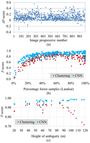 A more exhaustive performance comparison between the proposed approach and the baseline CL approach is presented in Figure 7, where all test images are considered. Figure 7a depicts the difference in F-score between the two methods. The parameter was evaluated with respect to the forest class. An increase was F-score was obtained for the vast majority of the images (positive values), indicating a significant performance improvement. Indeed, the mean F-score, computed over all the available acquisitions, was equal to 0.88 for the CNN-FNF map, while it reduced to 0.75 for the CL-FNF map case. Moreover, the effectiveness of the training strategy can be seen in Figure 7b, which depicts the performance obtained by comparing the forest classification for both considered approaches as a function of the percentage of forest in the image, according to the Landsat forest map used as a reference. An improvement in the detection of forest with the CNN-FNF map is overall observable but especially noticeable over densely forested areas (the percentage of forest samples > 80%). Differently, Figure 7c shows the performance obtained by comparing the forest classification as a function of the . To perform this last analysis, we considered a long time-series of TanDEM-X images acquired over the same area with varying acquisition geometry. The improvement in the classification of forest with the CNN-FNF map is clearly visible, especially for values of m, where the performance of the clustering approach appears to be strongly degraded. According to that, with the proposed method, single images acquired with higher can provide reliable detection of forested areas.