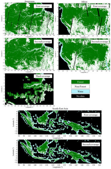 - Shimada, M.; Itoh, T.; Motooka, T.; Watanabe, M.; Shiraishi, T.; Thapa, R.; Lucas, R. New global forest/non-forest maps from ALOS PALSAR data (2007–2010). Remote Sens. Environ. 2014, 155, 13–31. [Google Scholar] [CrossRef]