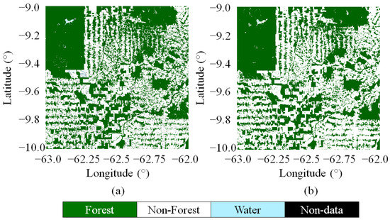 Validation maps obtained for geocell S10W063 over the state of Rondônia, Brazil: (a) Sentinel-2 and (b) TanDEM-X FNF maps from 2016.