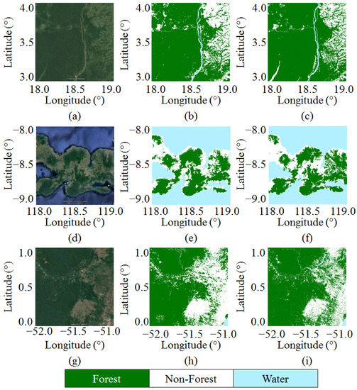 Large-scale mosaics intercomparison for different geocells. Top: Geocell N03E018 in Central Africa: (a) Google Earth ©, (b) TanDEM-X 2011 and (c) PALSAR 2010. Middle: Geocell S09E118 in South-East Asia: (d) Google Earth ©, (e) TanDEM-X 2013 and (f) PALSAR 2015. Bottom: Geocell N00W052 in Amazonas: (g) Google Earth ©, (h) TanDEM-X 2016 and (i) FROM-GLC 2017.