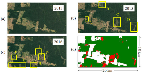 In order to provide a more detailed example of the accuracy of the generated product, we concentrate on the small patch highlighted by the yellow square, which is separately analysed in Figure 14. Here, three Landsat optical images of the region, acquired at the end of 2013, 2015 and 2016, respectively, are depicted together with the corresponding change map derived by differentiating the TanDEM-X CNN-FNF maps of 2013 and 2016. For each single year, the yellow squares superimposed to the optical images identify new clear-cuts. As it can be seen, all main detected clear-cuts (from A to H) are correctly detected in the CNN-FNF map as well (deforested 1100 ha). Only the clear-cut I is not detected, which is probably due to the fact that vegetation was cut down after the acquisition of the TanDEM-X image (the Landsat image in (c) is from December 2016).