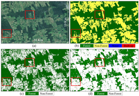 Example of high-resolution forest mapping with TanDEM-X at 12 m resolution. (a)—Landsat image acquired on 6 June 2018 (centre scene coordinates (lat,lon): (S, W). (b)—Corresponding land cover map at 10 m resolution from the WorldCover 2020 product [9]. (c,d)—TanDEM-X FNF maps at 12 m resolution obtained from an acquisition acquired on 28 May 2020, by applying the baseline clustering approach (c) and the proposed CNN (d). Red squares highlight some discrepancies among the different maps.