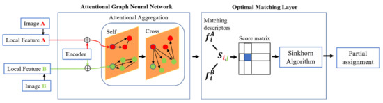 SuperGlue is a graph convolution feature matching network that can simultaneously perform feature matching and screen out false matching points. The network input is the feature points and descriptors extracted from two images by SuperPoint [20], and the output is the matching scores. As shown in Figure 4, the model framework is composed of the attentional graph neural network and the optimal matching layer. In the attentional graph neural network, the feature matching vectors are made up of the position of feature points and the feature descriptors through an encoder. The characteristic vectors are enhanced by the self-attention and cross-attention mechanisms. The attention mechanism is one of the key features of the SuperGlue network. It simulates artificial checking and confirming of matching features repeatedly through the self-attention and cross-attention mechanisms. The function of the whole module is to aggregate these attentions. In the optimal matching layer module, the attention aggregation feature is taken as the input to calculate the score matrix. The Sinkhorn algorithm is used to maximize the total matching score. The feature allocation matrix is then solved. The SuperGlue network demonstrated the powerful performance of the attentional graph neural network for local feature matching. This enabled high-precision relative to the 6DOF pose estimation and real-time indoors and outdoors operations.