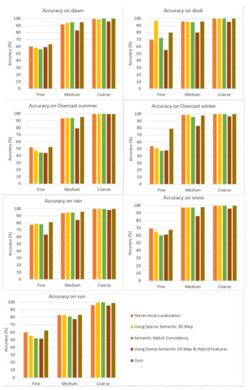 Table 1 and Figure 5 show the comparison. Table 1 shows that poor performance was obtained using the 2D image-based methods; this is because these methods avoid using spatial structure to reason localization. The performance of the hierarchical localization method and semantic fusion method is better than that of the structure-based method. This indicates that the prior usage of image retrieval or semantic information can effectively reduce the search space. This results in error reduction and increases feature matching accuracy. The hierarchical localization and the three semantic methods are similar to the proposed method. The accuracy of the five different methods is compared in Figure 4 using three different accuracy measures; the performance of the proposed method is reasonably good when evaluating high and medium precision. In addition to this, as seen in Table 1, better results are obtained using the proposed method in the majority of the cases, except for the dusk and snow scenarios. In high-precision and medium-precision evaluation measures, the proposed method improves upon the second-best method by 6.2% and 0.5 on average, respectively. It is also extremely close to the best result in coarse-precision evaluation measures.
