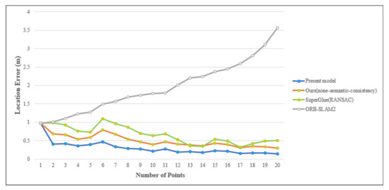 The proposed method calculates the transformation matrix between two images by matching results and then estimates the position and orientation. Matching results will inevitably have errors, even after optimization. In order to obtain more accurate position and orientation, semantic consistency is introduced into the RANSAC process to verify the accuracy of localization. The orange curve in Figure 9 shows the 6DOF pose estimation results without introducing semantic consistency, and the blue curve shows the 6DOF pose estimation results without introducing semantic consistency. As can be seen from the comparison, the error of the blue curve is lower than that of the orange curve at each point. It is proved that a semantic consistency check can effectively improve 6DOF pose accuracy.