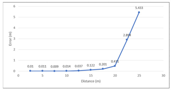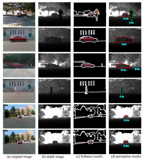 Figure 8 shows the target perception results. From left to right are the original image, depth image, instance results, and perception results. The results show that in the short range, the target can be effectively perceived with the segmentation results and depth information. Target perception can not only detect the class, but also can detect the range and orientation of the target. In addition, we tested the accuracy of the Realsense depth camera in obtaining depth information in outdoor scenes, and the results are shown in Figure 9. When the target distance is within the range of 0–6 m, the ranging accuracy reaches the highest; when the target distance is within the range of 6–15 m, the ranging error is not more than 1%; when the distance exceeds 15 m, the error of the depth camera starts to increase sharply; and when it exceeds 21 m, it almost fails. This is the result of the gradually smaller target and light factors. The experimental results show that the depth camera can effectively perceive the target in a close range when the light and other environmental factors are appropriate. The accuracy decreases with the increase of the distance.