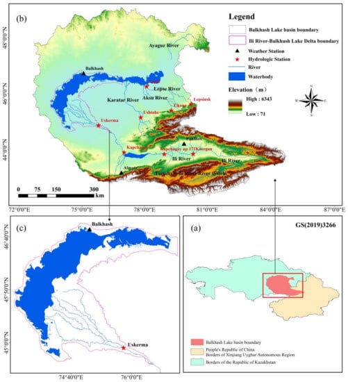 - Wang, Z.; Huang, Y.; Liu, T.; Zhong, R.S.; Zan, C.J.; Wang, X.F. Analyzing the water balance of Lake Balkhash and its influencing factors. Arid Zone Res. 2022, 39, 400–409. [Google Scholar]