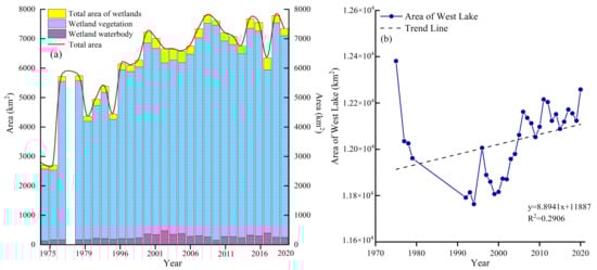 Figure 2a shows the change in the wetland area from 1975 to 2020. The wetland area in the IRD showed an increasing trend, with a change rate of 12.56 km2/10a. Wetland vegetation accounts for a major part of the total wetland area, and the trend of wetland vegetation is consistent with the total wetland area, with a more pronounced decrease from 1979 to 1992 and an increase after 1992. Wetland water bodies remained consistent with the change in total wetland area until 1979, and after 1979 the area of wetland water bodies did not change much.