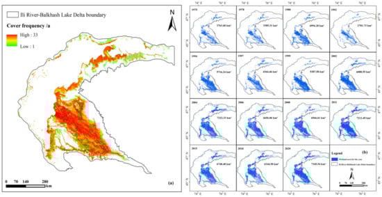The frequency map of wetland distribution in the IRD from 1975 to 2020 is shown in Figure 3a. The red areas with high coverage frequency represent the earliest wetlands in the study area, and the green areas with low coverage frequency represent the new wetlands. The maximum frequency of coverage was 33, and the color change from red to green shows the spatial expansion process of wetlands. The earliest wetlands in the study area are mainly distributed in the front and middle of the delta and along the bank of Lake Balkhash.