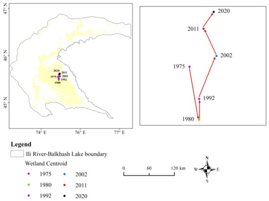 The centroid analysis method was used to analyze the distribution pattern and changes in wetlands in different categories by describing the change characteristics of the centroid distribution and direction of geographical elements [40]; a detailed description of the method can be found in Liu et al. [41].