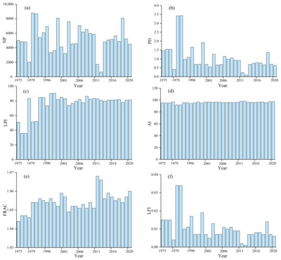 1975–2020 wetland landscape pattern index (number of patches (a), patch density (b), largest patch index (c), patch aggregation index (d), patch fractal dimension index (e), and landscape fragmentation index (f)).