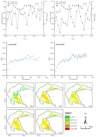 Relationship between wetland area and mean annual NDVI (a), wetland area and the maximum NDVI (b), change of NDVI with elevation from 2001 to 2005 (c), change of NDVI with elevation from 2016 to 2020 (d), and spatiotemporal variation of NDVI in the IRD wetlands during 2000 to 2020 (e).