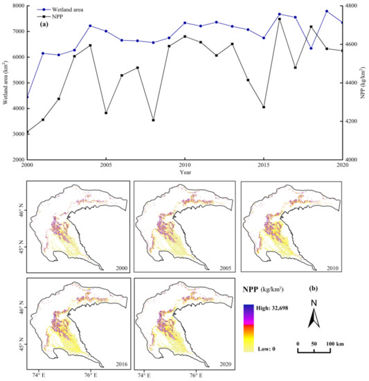 The value of NPP can directly reflect production capacity of plant communities under natural environmental conditions [43,44]. As shown in Figure 7a, from 2000 to 2020, the NPP of wetlands showed an increasing trend; the maximum value occurred in 2016, which was one of the years with a large wetland area, and the minimum value occurred in 2000, which was the year with the lowest wetland area.