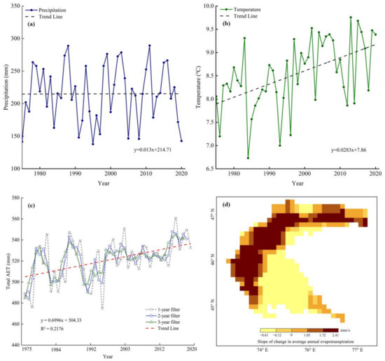 1975–2020 in the IRD annual precipitation (a); annual mean temperature in the lake region (b); annual mean ET (c); spatial trends in total ET (d).