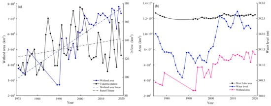 As shown in Figure 9a, both the annual discharges from the Uskerma station and wetland area in the IRD present an increasing trend from 1975 to 2020. The wetland area increased by 3581.94 km2 and the runoff volume at the Uskerma station increased by 10.71 km3. Comparing the change curves of the delta wetland area with the water level of Lake Balkhash and the area of Lake Balkhash West Lake (Figure 9b), it can be seen that from 1975 to 1990, the decrease in the water level of Lake Balkhash caused the area of Lake Balkhash West Lake to decrease, affecting 1990 to 2020. The rise in the water level of Lake Balkhash increased the area of the western lake of Lake Balkhash and affected the increase in the area of wetlands in the delta.
