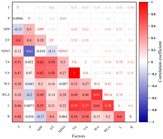 Changes in wetland area, NDVI, and NPP in the IRD are influenced by variable indicators. The Pearson correlation coefficient was used to test the correlation degree between the factors. The larger the Pearson correlation coefficient is, the higher the correlation degree [42].