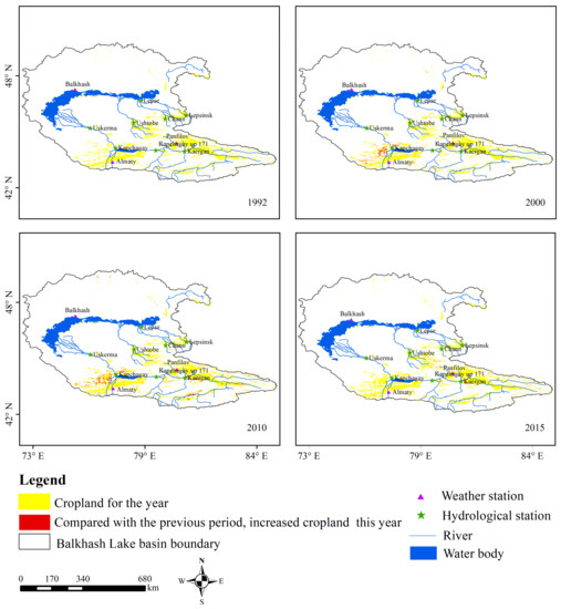 Changes in cultivated land in the Ili-Balkhash Lake Basin from 1992 to 2015.