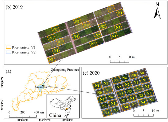 Two rice nitrogen fertilizer gradient trials were conducted at Zhongluotan Experimental Station (23°23′24”N–23°23′59”N,113°25′48”E–113°26′24”E), Baiyun District, Guangzhou City, Guangdong Province, China, in the autumns of 2019 and 2020. The layout of the plots in the experimental field is shown in Figure 1. In 2019, the rice variety was Meixiangzhan 2 (V1) and the planting date was 8 August. Rice was planted manually at a density of 20 cm × 20 cm in 60 plots with a plot dimension of 3.2 m × 3.2 m or an area of 10.24 m2. Only 15 plots were sampled and tested. The planting specifications were 16 × 16 clusters, making a total of 256 clusters/plot (Figure 1b). The rice varieties in the 2020 experiment were Meixiangzhan 2 (V1) and Wufengyou 615 (V2) and the planting date was 8 August. Manual planting was conducted at a density of 20 cm × 20 cm in 30 plots. The area of each plot was 13.12 m2 (3.2 m × 4.1 m) and all plots were sampled and tested. The planting specifications were 16 × 20 clusters per plot, with a total of 320 clusters/plot (Figure 1c).