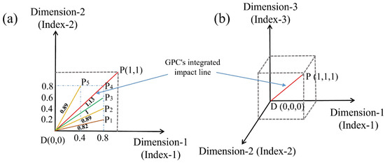 This study considered two- and three-dimensional monitoring indices constructed using two or three variables. The absolute distance between points in multidimensional space was measured by the Euclidean distance method to express crop growth under multiple influences. As shown in Figure 2, each axis in multidimensional space was used to represent one variable affecting rice GPC, which was calculated as per Equation (13):