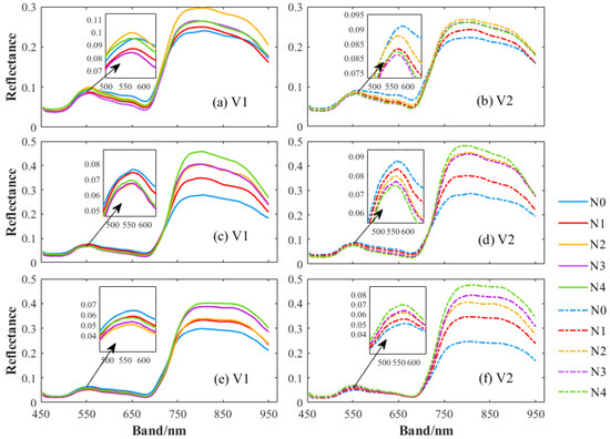 Canopy reflectance spectra of different rice varieties (V1 = Meixiangzhan 2 and V2 = Wufengyou 615) with different nitrogen fertilization levels. Reflectance of (a) V1 and (b) V2 at the tillering stage, (c) V1 and (d) V2 at the panicle initiation stage, and (e) V1 and (f) V2 at the heading stage.
