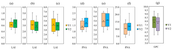 Data distribution box plots for leaf area index (LAI), plant nitrogen factor (PNA), and grain protein content (GPC) in rice varieties V1 (Meixiangzhan 2) and V2 (Wufengyou 615). LAI at (a) the tillering stage, (b) panicle initiation stage, and (c) heading stage; PNA at (d) the tillering stage, (e) panicle initiation stage, and (f) heading stage; and (g) GPC at the maturity stage.