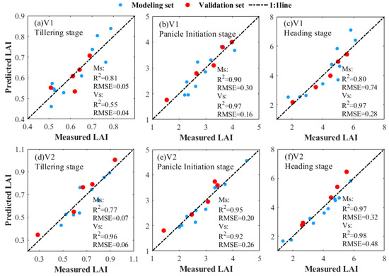 Scatterplots of measured and predicted leaf area index (LAI) values for rice varieties: V1 (Meixiangzhan 2) at (a) the tillering stage, (b) panicle initiation stage, and (c) heading stage; and V2 (Wufengyou 615) at (d) the tillering stage, (e) panicle initiation stage, and (f) heading stage.
