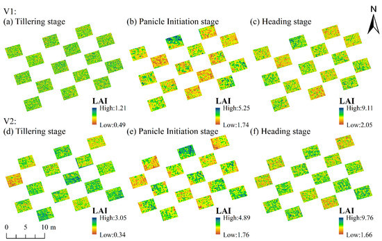 Rice leaf area index (LAI) maps of the study area. Variety V1 (Meixiangzhan 2) at (a) the tillering stage, (b) panicle initiation stage, and (c) heading stage; and variety V2 (Wufengyou 615) at (d) the tillering stage, (e) panicle initiation stage, and (f) heading stage.