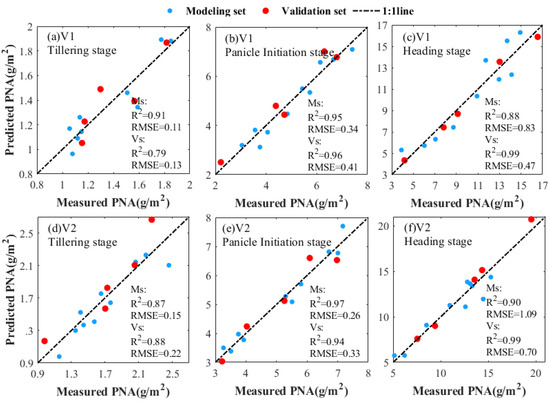 Scatterplots of measured and predicted plant nitrogen accumulation (PNA) values in variety V1 (Meixiangzhan 2) at (a) the tillering stage, (b) panicle initiation stage, and (c) heading stage; and in variety V2 (Wufengyou 615) at (d) the tillering stage, (e) panicle initiation stage, and (f) heading stage.