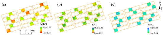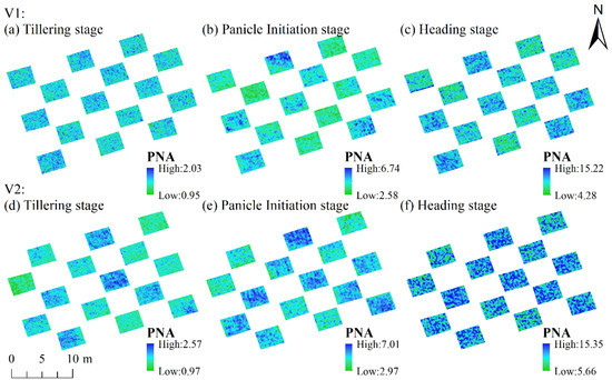 Both rice varieties V1 and V2 had good modeling and validation accuracy in all three growth stages (Table 6). Figure 7 shows scatterplots of the predicted and measured PNA values, which are more closely distributed on both sides of the 1:1 line. The R2 values of the modeling and validation sets were greater than 0.86 in all three stages, except for the validation set in the tillering stage (0.79). The PNA distribution maps of the study area were obtained based on the regression equations for each growth stage (Figure 8).