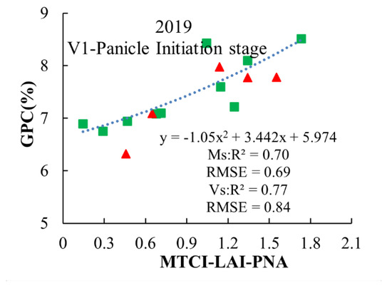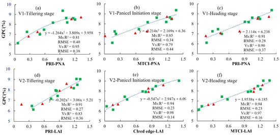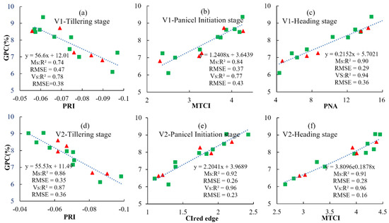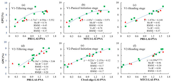 Table 7 shows the coefficients of correlation of rice GPC with three VIs, LAI, and PNA. Then, the best VI that was most closely related to GPC was selected and combined with LAI and PNA by the Euclidean distance method to explore their effects on GPC monitoring. From Table 7, PRI, LAI, and PNA were selected as indicators for constructing GPC monitoring indices for both varieties at the tillering stage. MTCI was selected for variety V1 and CIred edge for variety V2 to integrate LAI and PNA at the panicle initiation stage as indicators for the construction of the GPC monitoring index. PRI was selected for variety V1 and MTCI for variety V2 to incorporate LAI and PNA as indicators for constructing GPC monitoring indices at the heading stage.
