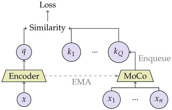 - He, K.; Fan, H.; Wu, Y.; Xie, S.; Girshick, R. Momentum Contrast for Unsupervised Visual Representation Learning. In Proceedings of the 2020 IEEE/CVF Conference on Computer Vision and Pattern Recognition (CVPR), Virtual, 14–19 June 2020; pp. 9726–9735. [Google Scholar] [CrossRef]