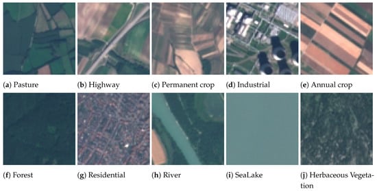 - Helber, P.; Bischke, B.; Dengel, A.; Borth, D. Eurosat: A novel dataset and deep learning benchmark for land use and land cover classification. IEEE J. Sel. Top. Appl. Earth Obs. Remote Sens. 2019, 12, 2217–2226. [Google Scholar] [CrossRef]
